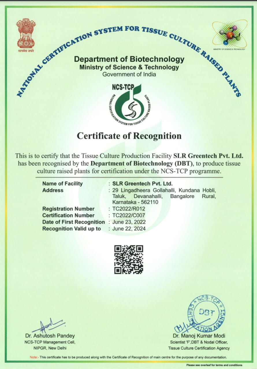 SLR Green Tech is proud to be certified under the National Certification System for Tissue Culture Raised Plants, ensuring the highest standards of quality and genetic purity.
